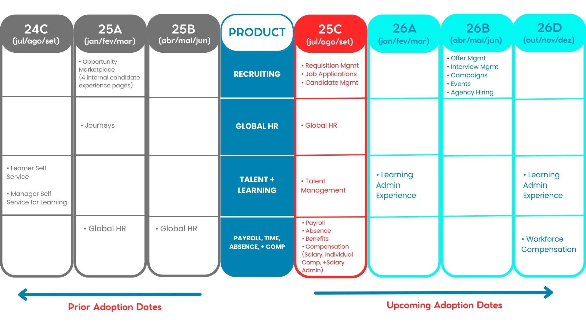 O calendário oficial de releases da Oracle, apresentado no quadro abaixo, mostra de forma clara quais módulos já tiveram o fim do suporte e quais ainda terão mudanças em breve. Entre eles, funcionalidades como Learner Self Service, Manager Self Service for Learning e Time + Labor (para entrada de ponto via desktop) já não contam mais com o suporte da Oracle, o que traz riscos operacionais urgentes para empresas que não migraram para o Redwood.